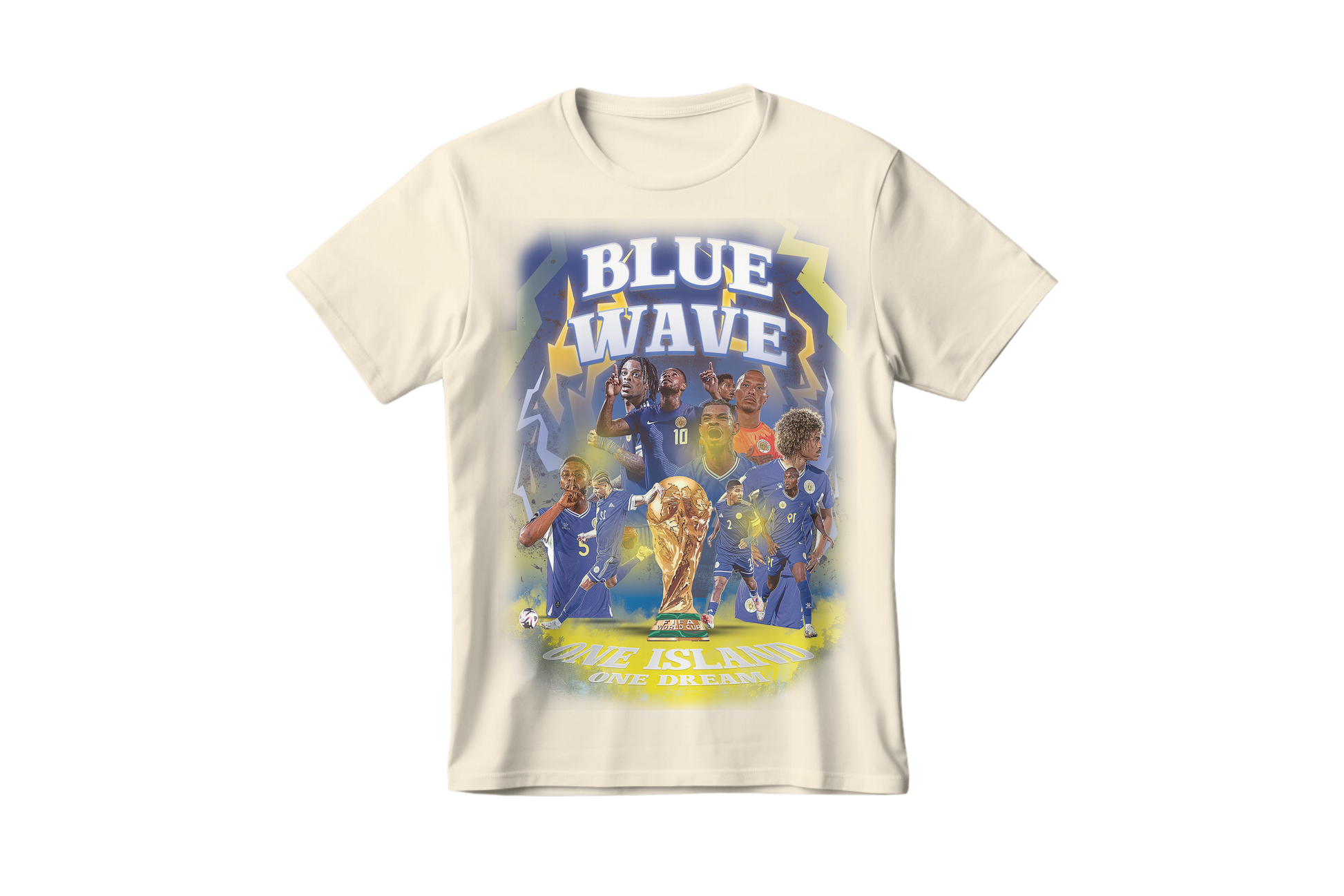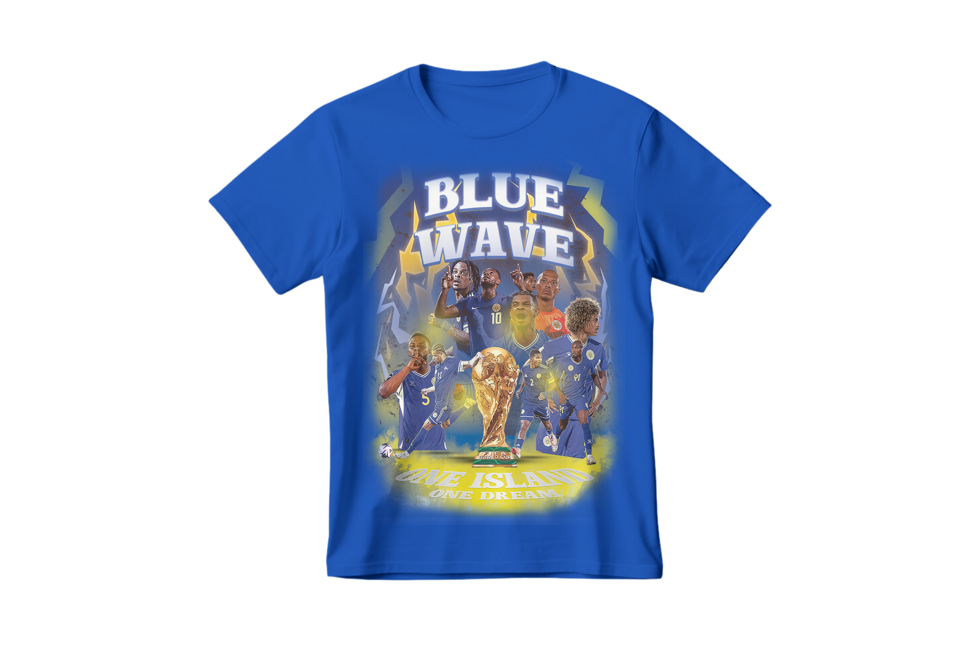 Celebrate history with this special edition Blue Wave T-shirt, honoring Curaçao’s legendary rise as the smallest nation ever to reach the World Cup. Featuring powerful artwork of the team, vibrant island colors, and the iconic trophy at center stage, this design captures the pride, determination, and unity of a nation that defied all odds. One Island. One Dream. One historic moment.